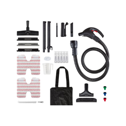 | Priedai pridėti | 15 included accessories: universal brush with frames, steam + vacuum nozzle, window cleaning accessory 200 mm, steam concentrator + small nylon brush, steam lance, suction lance, 3 small coloured nylon brushes, cloth for all floors, sockette, jug, tank cleaning brush, accessory storage bag, 5 vials of bioecologico. |