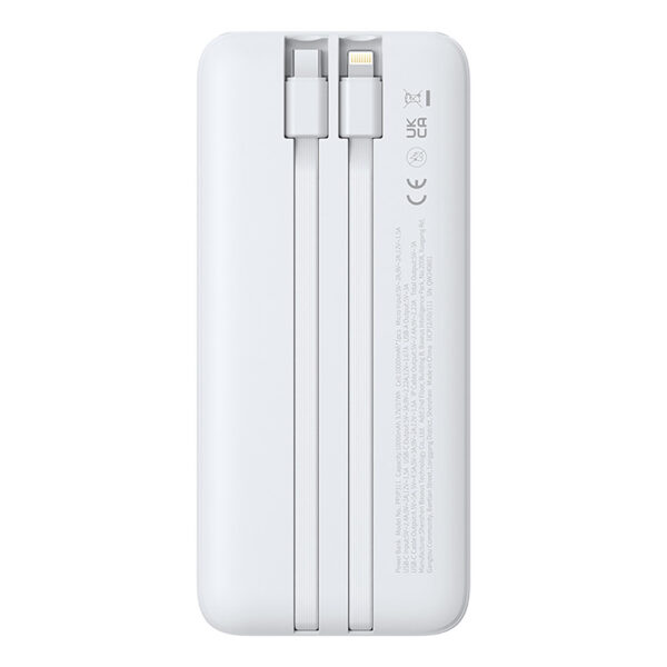 Powerbank ma zintegrowane przewody USB-C oraz Lightning, które umożliwiają ładowanie urządzeń bez dodatkowych akcesoriów.
