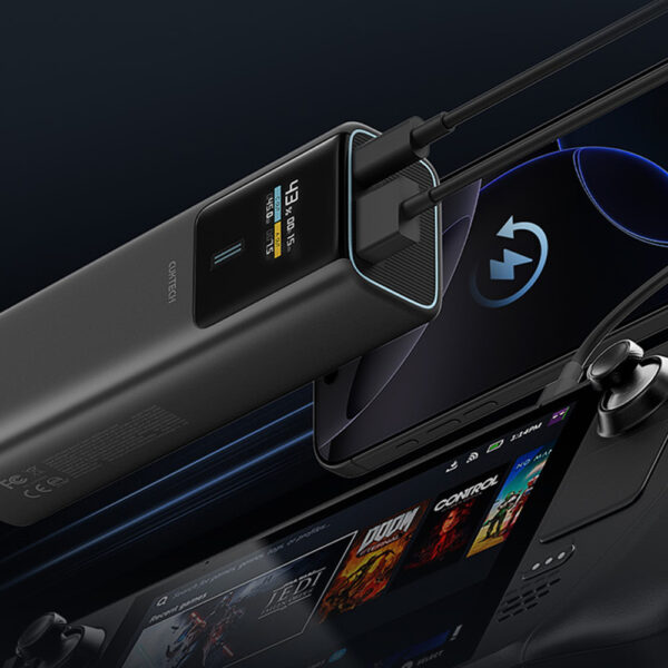The Cuktech CKPB100PGLBL is a modern power bank with a capacity of 10,000 mAh and output of up to 150W, providing ultra-fast charging for laptops, smartphones, and tablets. With a USB-C output of up to 120W and a USB-A output of up to 33W, you can charge even the most demanding devices. The color TFT screen displays key information about voltage, current, charge level, and remaining runtime in real time. The power bank supports fast reverse charging up to 90W, allowing you to replenish 55% of its capacity in just 15 minutes. Despite its enormous capabilities, it remains compact and lightweight, and its VO265 fire-resistant housing and nine layers of protection ensure complete safety.