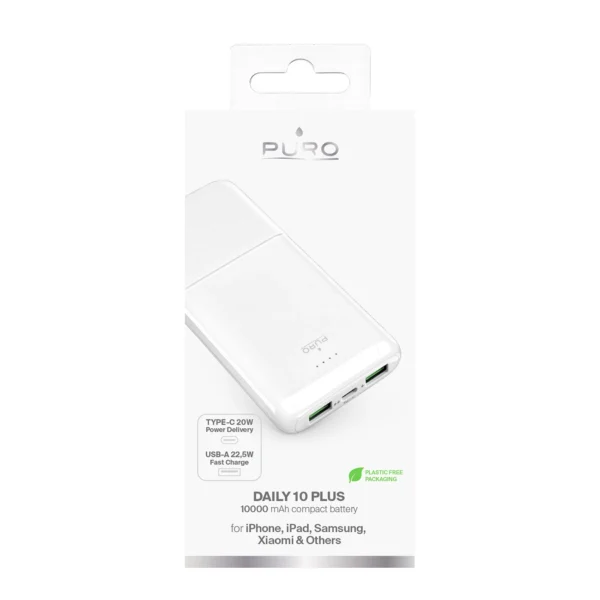 Powerbank Puro DAILY 10 PLUS 10000mAh 2x USBA / 1x USB-C 22.5W – baltos spalvos