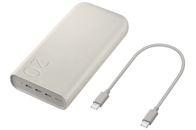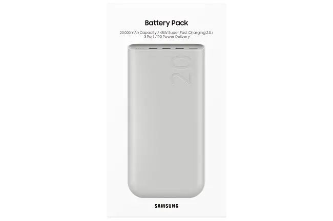 45 W didelės talpos 20 000 mAh nešiojamoji baterija su itin greitu įkrovimu 2.0 leidžia greitai įkrauti suderinamus trečiųjų šalių ir „Samsung” įrenginius, įskaitant pačią nešiojamąją bateriją, kai jis išsikrauna. Įrengta „Power Delivery 3.0″ ir USB-C jungtis, kad galėtumėte įkrauti įrenginius keliaudami.