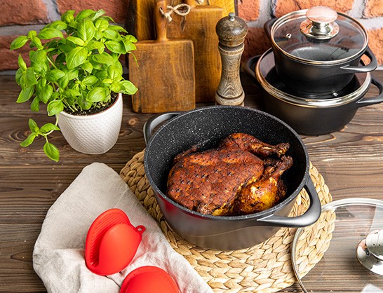 - Puodai pagaminti iš liejo aliuminio. Dėl ypatingos dugno ir sienų struktūros šiluma pasiskirsto tolygiai. Be to, MGK-18 puodų vidus padengtas ILAG nepridegančia danga. Taigi galime pasigaminti mėgstamus patiekalus nebijodami jų sudeginti.