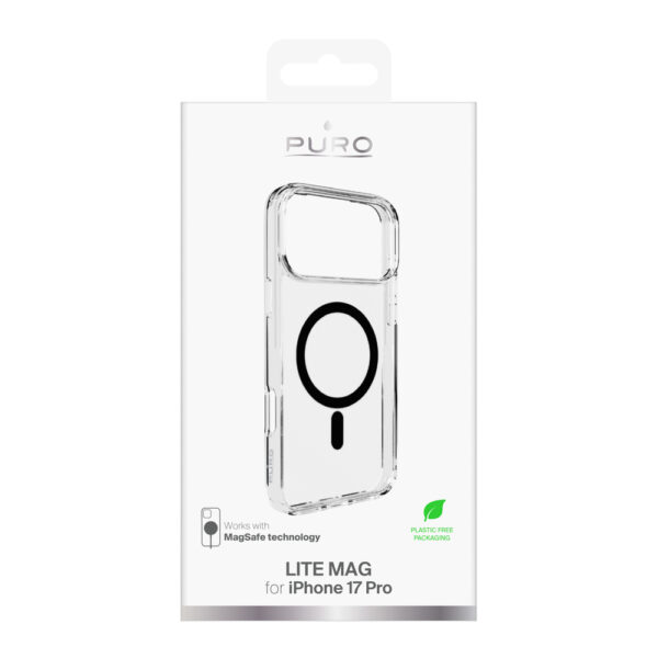 Puro Lite Mag TPU+PC dėklas suderinamas su MagSafe skirtas Apple iPhone 17 Pro – skaidrus su juodos spalvos žiedu