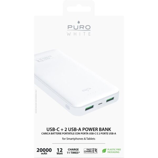 PURO White Fast Charger Power Bank – Power bank for smartphones and tablets 20000 mAh, 2xUSB-A + 1xUSB-C (white)