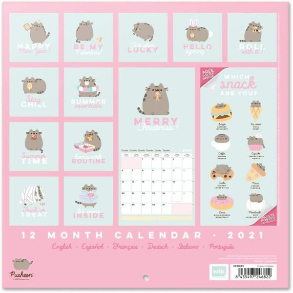 Pusheen calendar for 2021 presenting the image of the iconic cat. Perfect for placing on a desk, it can also be used as a wall calendar. Includes space for daily notes. Made of high quality laminated paper.
