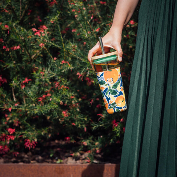 Quokka Liquid Cube – Glass mug 540 ml with stainless steel straw (Oranges)