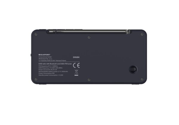 Prekės ženklas- Blaupunkt. Ilgis- 257 mm. Plotis- 80 mm. Aukštis- 126 mm. Imtuvo diapazonas- DAB+, FM. Stočių atmintis- 80. Maitinimo šaltinis- USB, Baterija. LCD ekranas- Taip. Žadintuvas- Taip. Interneto radijas- Ne. 3.5mm ausinių lizdas- Taip. CD grotuvas- Ne. Privaloma garantija- 24 mėn. Garantija juridiniams asmenims- 12 mėn.