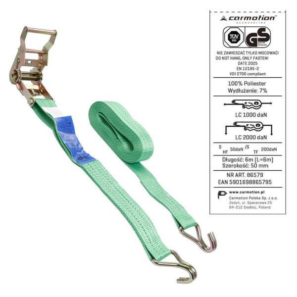Ratchet tie down strap, 50 mm, max 2000 kg, 6 m