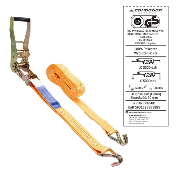 Ratchet tie down strap, 50 mm, max 5000 kg, 6 m