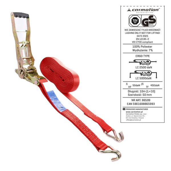 Ratchet tie down strap ERGO, 50 mm, 10 m, max 5000 kg