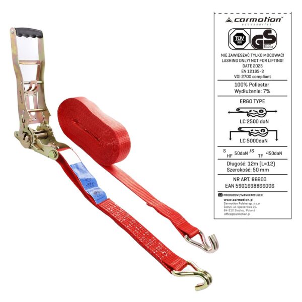Ratchet tie down strap ERGO, 50 mm, 12 m, max 5000 kg