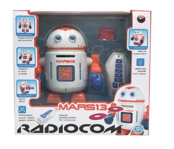 Prekės ženklas- -. Artikulas- 40945. Spalva- Įvairių spalvų. Medžiaga- Plastikas. Valdoma radijo bangomis- Taip. Modelis- Radiocom Mars 13. Naudojama su baterijomis- Taip. Įspėjimas dėl žaislų- Pašalinkite visą pakuotę, tvirtinimo detales prieš perduodant šį žaislą vaikui. Ant pakuotės esančią informaciją rekomenduojama išsaugoti. Rekomenduojama naudoti prižiūrint suaugusiems. Gali būti smulkių arba aštrių detalių, kuriomis vaikas gali užspringti arba susižeisti.. Rekomenduojamas amžius nuo- 5 m.. Privaloma garantija- 24 mėn. Garantija juridiniams asmenims- 12 mėn.