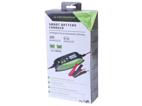 The charger is intelligent, microprocessor-controlled – when fully charged, it automatically turns off, keeping the battery ready – 100% safe for any battery. The efficiency is comparable to charging with professional devices (even 5x more expensive) – using a smart charger does not adversely affect the operation of the battery. The charging process complies with the guidelines contained in the warranty cards of leading brands of storage tanks – its use is completely safe. Suitable for both 6V and 12V batteries with a capacity of 1.2 – 120Ah.