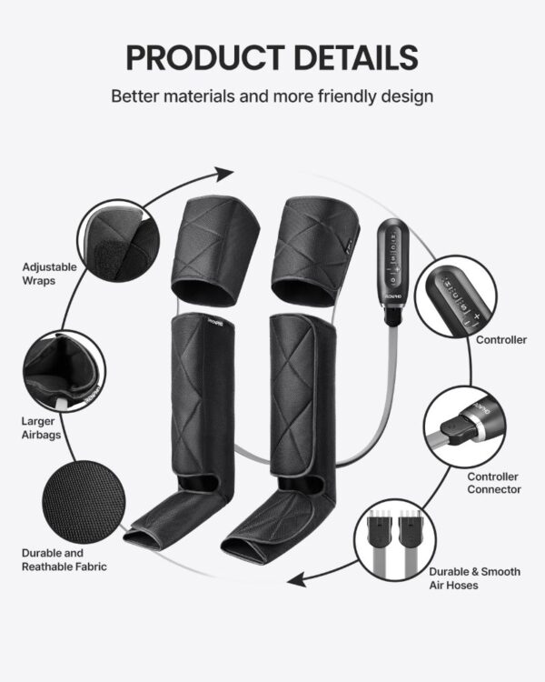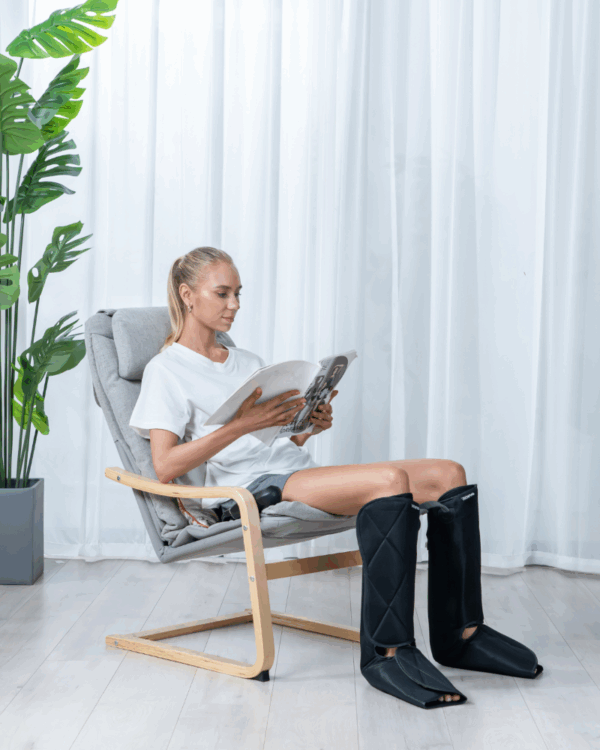 Ergonomiškas dizainas su reguliuojamais įvyniojimais ir saugiais „Velcro“ dirželiais patogiai priglunda prie įvairaus dydžio kojų. Patogus rankinis valdymo pultas leidžia lengvai pasirinkti režimus, reguliuoti intensyvumą ir šildymą, o automatinis išsijungimo laikmatis užtikrina saugumą ir apsaugo nuo per ilgai trukusio naudojimo.
