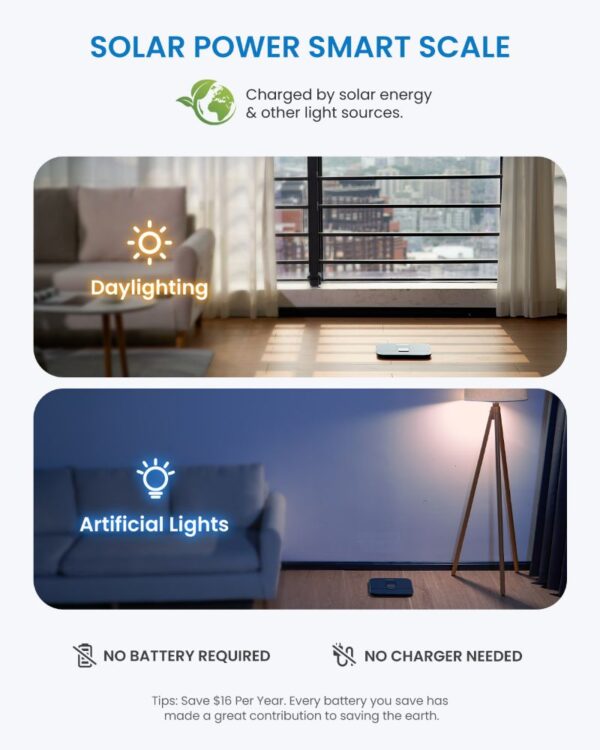 Patogus ir saugus dizainas: Stilinga 11,02 colio platforma su pilno padengimo pagrindu užtikrina stabilumą ir saugumą. Svarstyklės taip pat palaiko USB-C įkrovimą – viena įkrova leidžia naudotis įrenginiu iki 100 dienų.