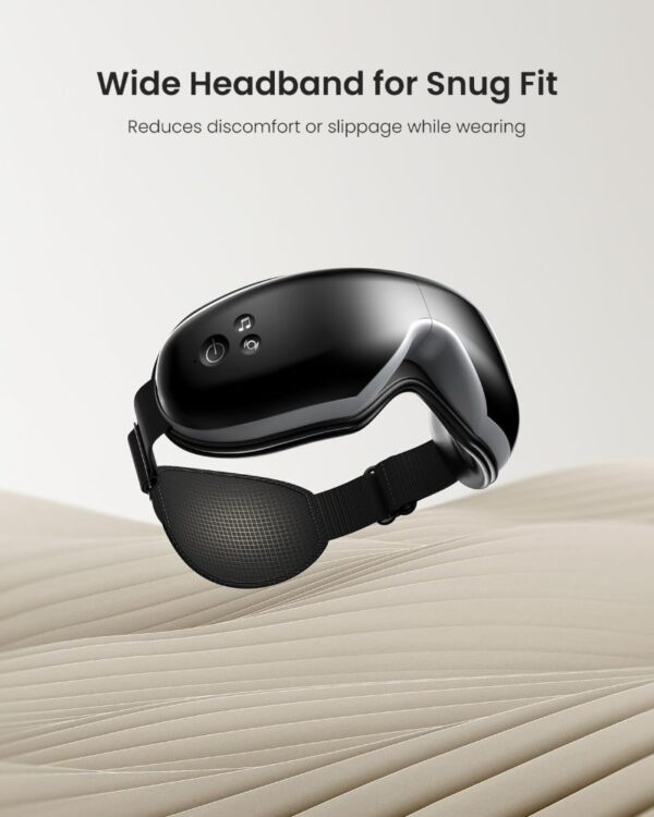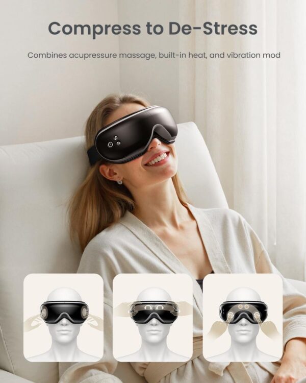 3 lygio šildymas ir kompresinis masažas: Įmontuoti šildymo elementai leidžia pasirinkti aukštą, vidutinį arba žemą šilumos lygį (40–45 °C), padedantį atsipalaiduoti ir palaikyti akių komfortą.