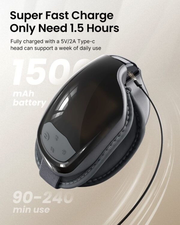 „Eyeris 3“ akių masažuoklis turi integruotą baltojo triukšmo muziką, kuri mažina nerimą ir gali būti išjungta pagal poreikį. Mėgaukitės „Bluetooth“ muzikos ryšiu ir raminančia atmosfera. 1500 mAh įkraunama baterija pilnai įkraunama vos per 1,5 val., o raudonas LED indikatorius rodo įkrovimo būseną – patogumas kasdieniam naudojimui.