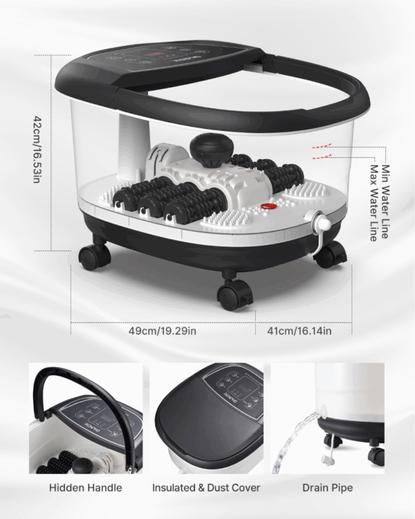 Kojų vonelė RENPHO Pro JD618 – tai daugiafunkcinė kojų vonelė, sukurta pavargusioms kojoms atpalaiduoti naudojant šiltą vandenį, masažo ritinėlius, burbulus ir reguliuojamą šildymą. Ji aprūpinta greitai įkaistančia PTC šildymo sistema su temperatūros nustatymu nuo 35°C iki 48°C ir integruotu laikmačiu, o trys automatiniai masažo režimai leidžia pritaikyti masažą pagal asmeninius atsipalaidavimo poreikius. Renpho masažinė kojų vonelė yra patogi ir lengvai prižiūrima – su ratukais, rankena ir nutekėjimo sistema ji užtikrina kasdienį komfortą ir praktiškumą.