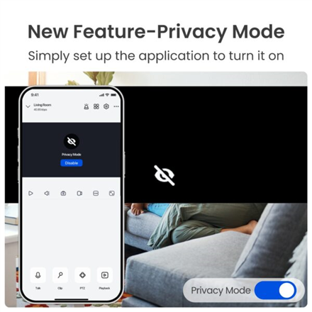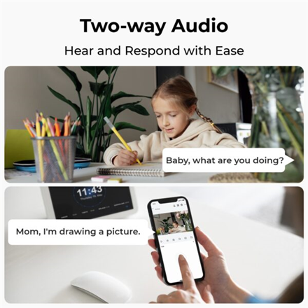 | Techniniai parametrai | Night Vision: Infrared (12m, 8 LEDs); Pan/Tilt: 355° Pan, 50° Tilt, up to 15 preset positions, auto-tracking; AI Detection: Motion/Human/Pet/Crying; Smart Home: Alexa, Google Assistant |