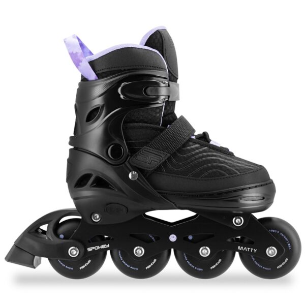 Prekės ženklas- Spokey. Artikulas- 943452. Spalva- Juoda sp., Violetinė sp.. Medžiaga- Plastikas. Važiuoklės medžiaga- Aliuminis. Ratukų medžiaga- Poliuretanas. Dydis- 39-42. Riedučių užsegimas- Juostelė. Šalmas komplekte- Ne. Apsaugos komplekte- Ne. Reguliuojamas dydis- Taip. Įspėjimas!- Nenaudoti arti važiuojamosios kelio dalies, motorinių transporto priemonių, stačių šlaitų, laiptų, baseinų ar kitų vandens šaltinių., Naudoti su apsauginiu šalmu. Didžiausias naudotojo/-ų kūno svoris- 100 kg. Privaloma garantija- 24 mėn.