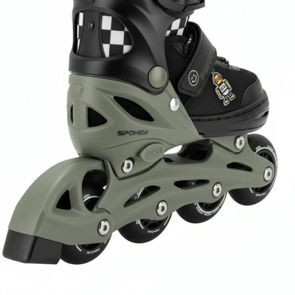 Prekės ženklas- Spokey. Artikulas- POPPY GN. Spalva- Juoda sp., Žalia sp.. Medžiaga- Poliesteris, Polipropilenas (PP). Važiuoklės medžiaga- Polipropilenas (PP). Ratukų medžiaga- Poliuretanas. Ratukų skersmuo- 64 mm. Dydis- 31-34. Riedučių užsegimas- Juostelė, Lipukai. Šalmas komplekte- Ne. Apsaugos komplekte- Ne. Reguliuojamas dydis- Taip. Didžiausias naudotojo/-ų kūno svoris- 60 kg. Privaloma garantija- 24 mėn.