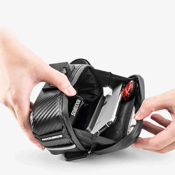 The Rockbros B59 bike bag is a sturdy under-seat bag with a capacity of approximately 1.5 L, designed for convenient storage of essentials while riding. Its rigid, carbon-fiber-textured construction protects its contents and maintains its shape even with heavy use. A large side opening allows for quick access to stored items, while internal pockets help keep things organized. A stable under-seat mounting system ensures secure attachment, while a reflective element and optional light attachment enhance visibility after dark.