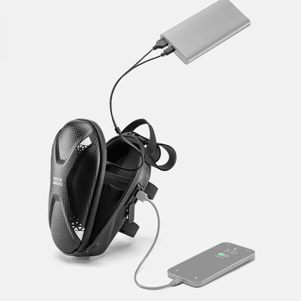 The integrated charging port in the Rockbros 3011006301 bag allows you to charge your phone or other devices directly from the powerbank placed in the bag. This means that even during long trips you don't have to worry about the battery level of your device.