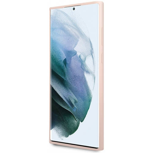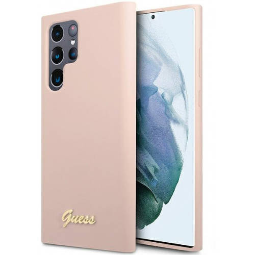 Samsung Galaxy S23 Ultra Guess silikoninis dėklas Script Metal Logo (GUHCS23LLSLMGPP) rožinės spalvos