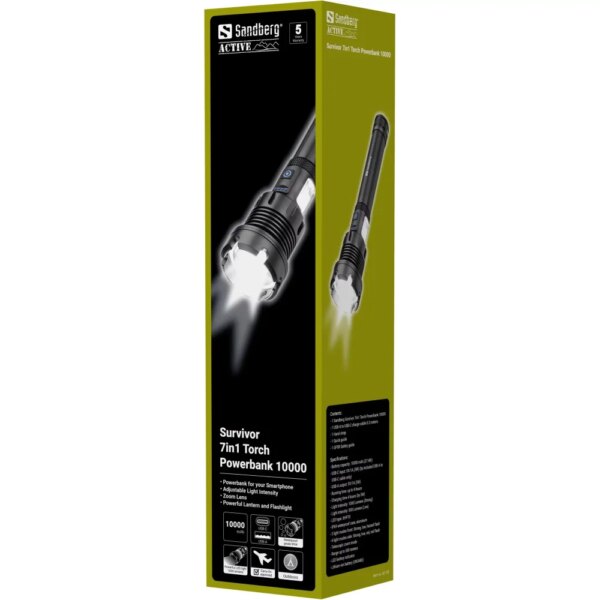 „Sandberg Survivor 7in1 Torch Powerbank 10000“ puikiai tinka tiek stovyklavimui, tiek žygiui gamtoje. Turėsite įrenginį su daugybe naudingų funkcijų: galingas šviesos diodų žibintuvėlis su keliais ryškumo lygiais ir priartinimo objektyvu, šoninis žibintas su keliomis funkcijomis ir raudonos šviesos parinktis. Integruota įkraunama baterija veikia kaip apšvietimo baterija, bet taip pat gali būti naudojama kaip nešiojamasis įkroviklis išmaniajam telefonui įkrauti per integruotą USB jungtį. Tvirtas, pagamintas iš IPx4 sertifikuoto aliuminio, todėl galite saugiai nešiotis su savimi net atšiauriomis sąlygomis. Be to, tvirčiausia žibintuvėlio dalis gali būti naudojama kaip avarinis plaktukas.