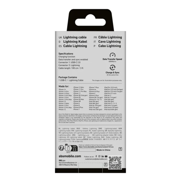 With the "Made for iPhone" certification, the SBS TECABLELIGTC1K cable ensures compatibility with Apple devices, protecting them from damage and ensuring their optimal performance.