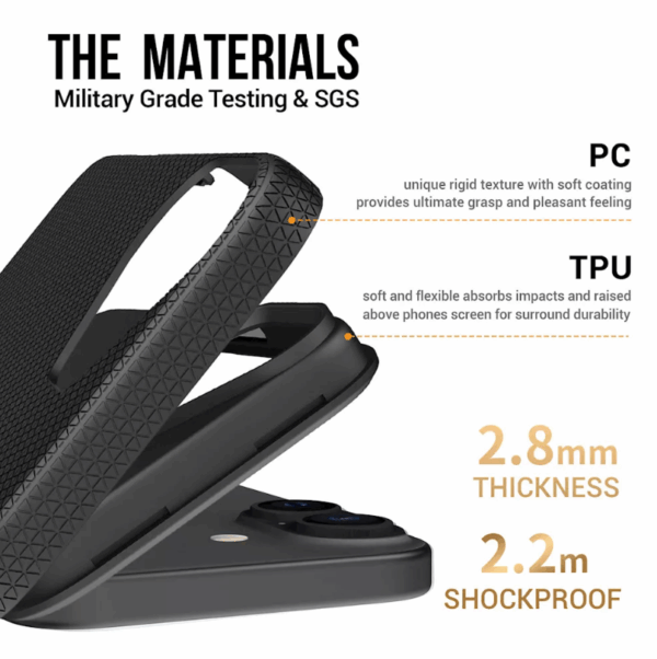 Pagamintas iš dviejų pažangių medžiagų – smūgiams atsparaus TPU ir įbrėžimams atsparaus polikarbonato (PC) – šis dėklas apsaugo nuo kritimų, smūgių ir kasdienio nusidėvėjimo. Pakelti kraštai dar labiau apsaugo ekraną nuo tiesioginių smūgių.