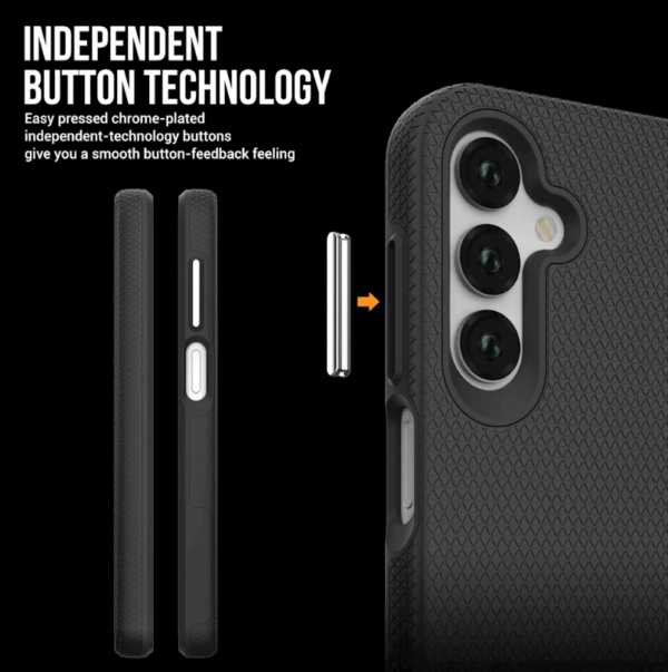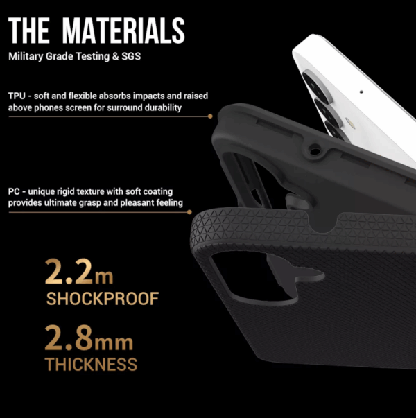 Pagamintas iš dviejų pažangių medžiagų – smūgiams atsparaus TPU ir įbrėžimams atsparaus polikarbonato (PC) – šis dėklas apsaugo nuo kritimų, smūgių ir kasdienio nusidėvėjimo. Pakelti kraštai dar labiau apsaugo ekraną nuo tiesioginių smūgių.