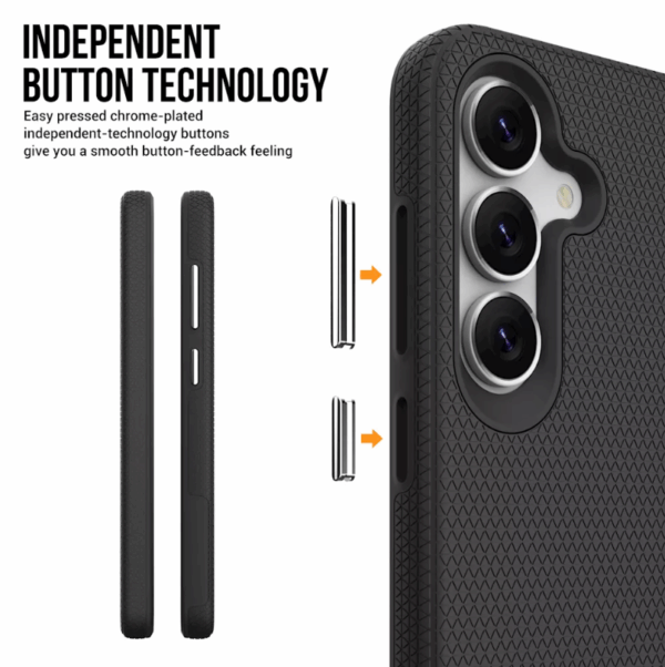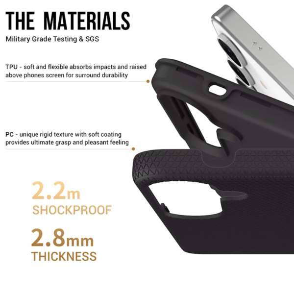 Pagamintas iš dviejų pažangių medžiagų – smūgiams atsparaus TPU ir įbrėžimams atsparaus polikarbonato (PC) – šis dėklas apsaugo nuo kritimų, smūgių ir kasdienio nusidėvėjimo. Pakelti kraštai dar labiau apsaugo ekraną nuo tiesioginių smūgių.