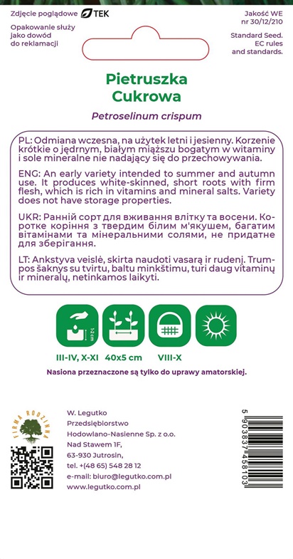 Prekės ženklas- -. Sėklos daiginimui- Ne. Daržovių ar vaisių rūšis- Šakniavaisinės petražolės. Svoris- 5 g.