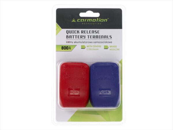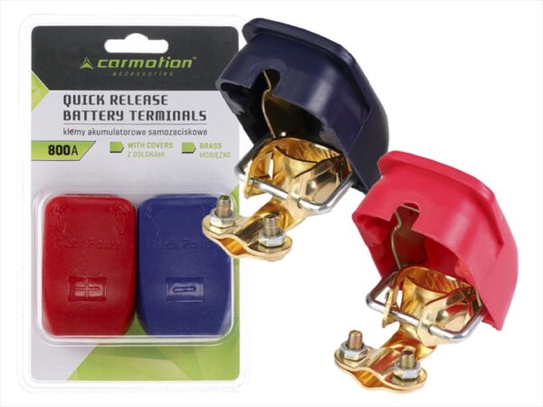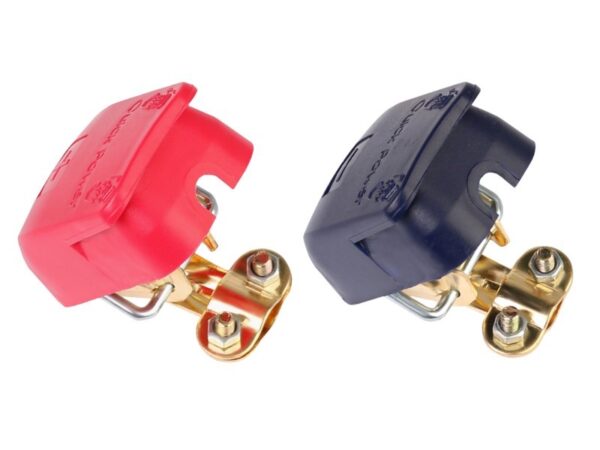 Self-locking battery clamps with covers that protect against electric shock and short circuit. Made of brass, steel and polypropylene. Assembly and disassembly are carried out without tools.