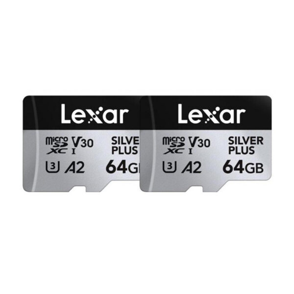 Set of 2 Lexar High-Performance Silver Plus microSDXC 2x64GB memory cards + adapter