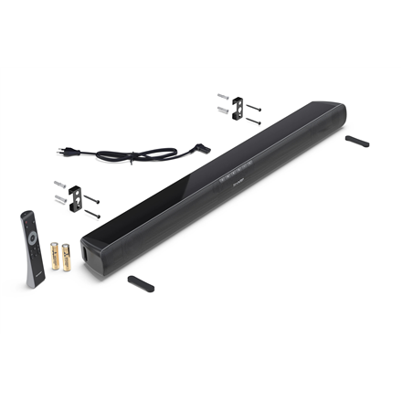 | Priedai pridėti | Soundbar, Remote control (inc. batteries), Power cable, Wallmount fixings, Silicone feet (for Soundbar), User documentation |