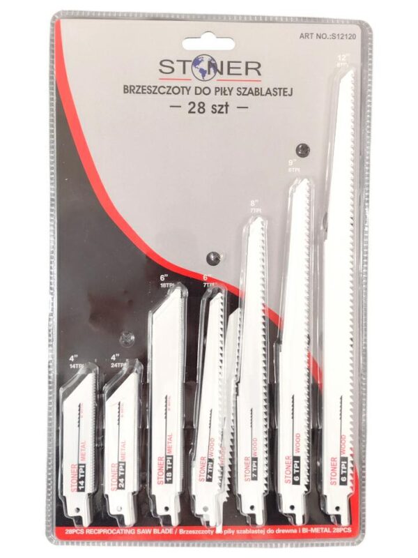 Rinkinio turinys: Metalui: 6″ – 18 TPI › 4 vienetai 4″ – 24 TPI › 4 vienetai 4″ – 14 TPI › 4 vienetai Medienai: 12″ – 6 TPI › 4 vienetai 9″ – 6 TPI › 4 vienetai 8″ – 7 TPI › 4 vienetai 6″ – 7 TPI › 4 vienetai Techniniai duomenys: Prekės ženklas: Stoner Tipas: pjūkleliai slankiojančiam pjūklui (tiesiniam pjūklui) Elementų skaičius: 28 vienetai Medžiaga: HCS / HSS Ilgio diapazonas: 4″ – 12″ (100 – 300 mm) Paskirtis: metalas, mediena