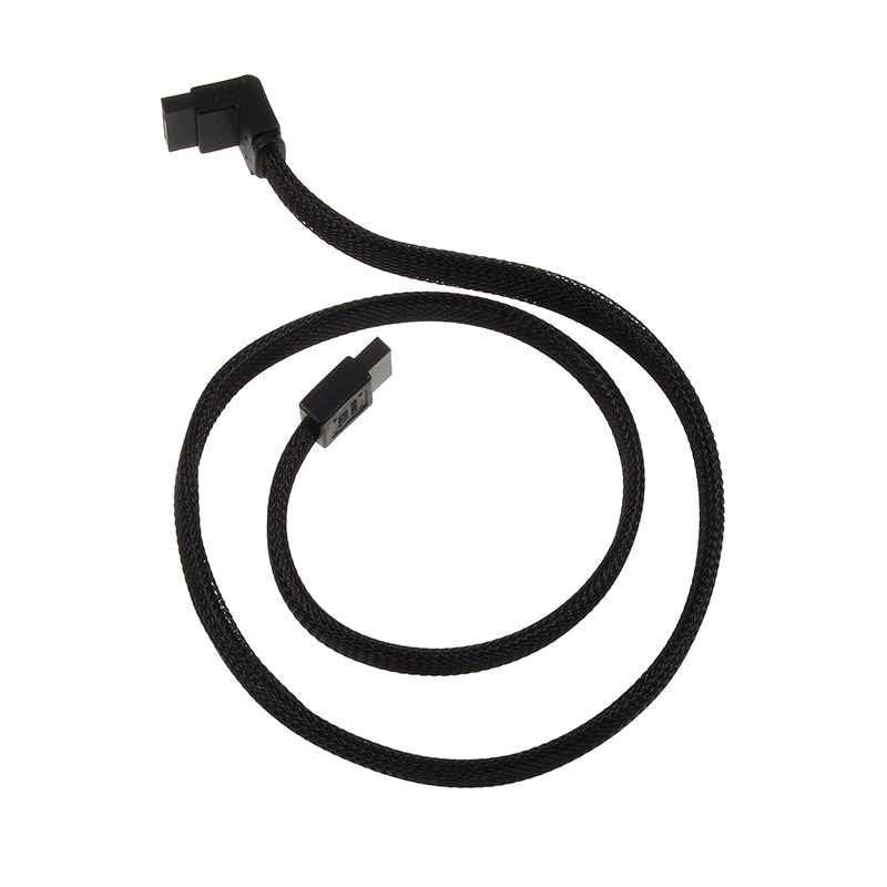 Hierbei handelt es sich um ein 50 cm langes SATA III Kabel von Qualitätshersteller SilverStone, das mit einem schwarzen Sleeve versehen ist und einen geraden sowie einen gewinkelten Stecker bietet.