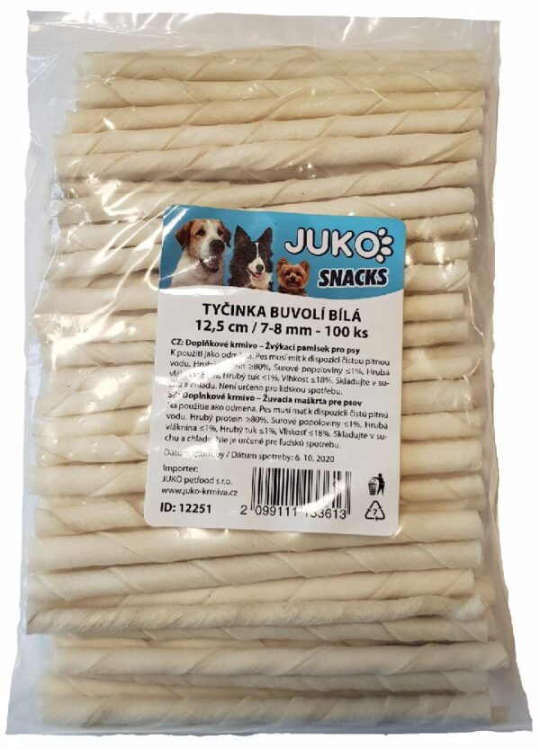 Skanėstas iš buivolo odos balta JUKO Užkandžiai12,5 cm, 7 – 8 mm (100 vnt), 1 vnt.