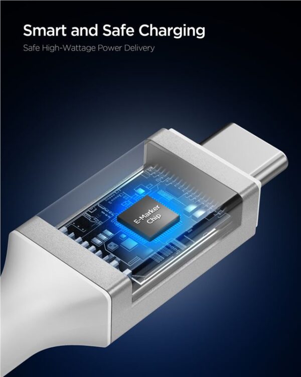 Made of durable, flexible TPE material with a PVC sheath, the cable is resistant to everyday use. Thanks to Durabend technology, the cable is tested for over 10,000 bends, ensuring a long service life. The integrated E-Marker chip ensures intelligent and safe charging, protecting connected devices from overload. Its 100 cm length makes it practical for home, office, or travel—ideal for everyday use.