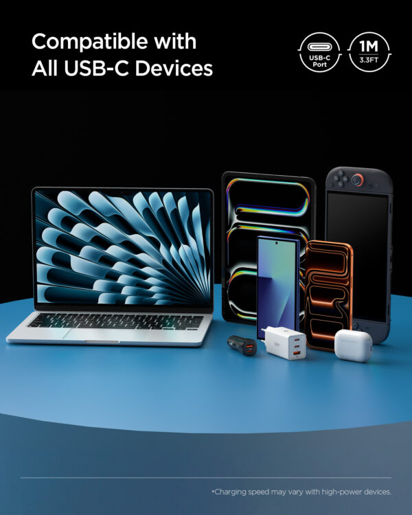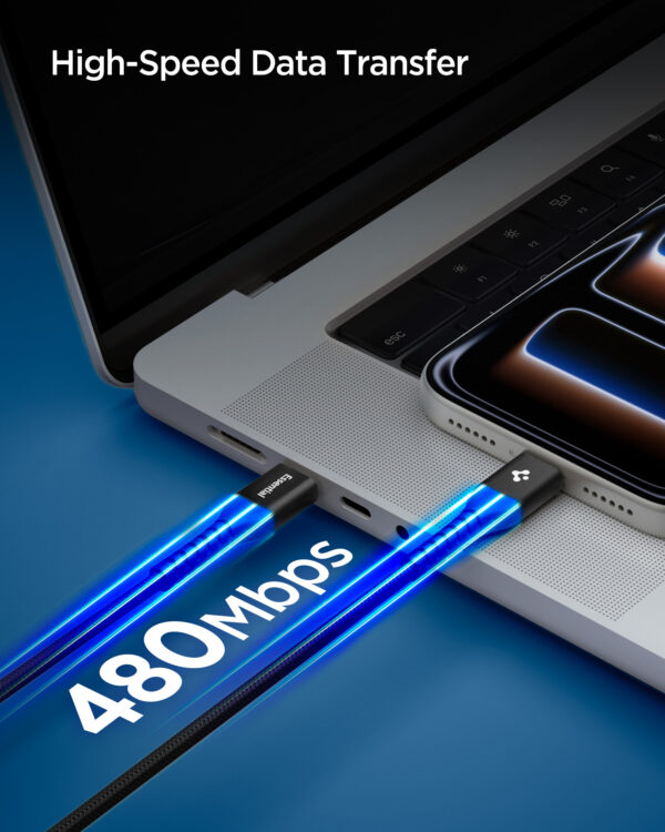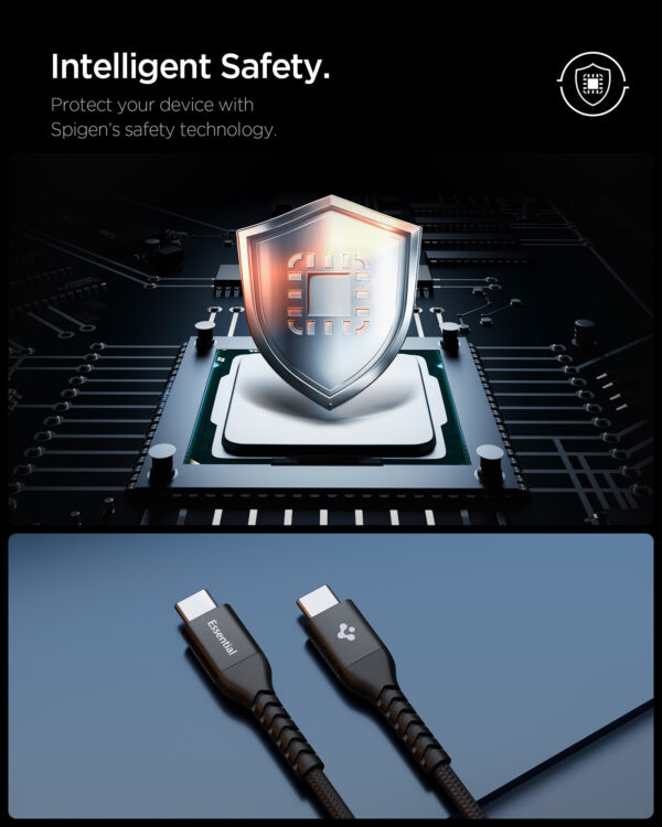 Kabelis Spigen EB10010CCA Essential – tai universalus USB-C laidas, kurio ilgis 100 cm, palaikantis iki 100W įkrovimo galią ir duomenų perdavimą iki 480 Mbps greičiu. Dėl didelės išėjimo galios šis laidas puikiai tinka tiek greitam išmaniųjų telefonų, planšetinių kompiuterių, tiek nešiojamųjų kompiuterių su USB-C jungtimi įkrovimui. Vienu metu vykstantis duomenų perdavimas leidžia patogiai perkelti failus tarp įrenginių įkrovimo metu, todėl nereikia naudoti kelių skirtingų laidų.