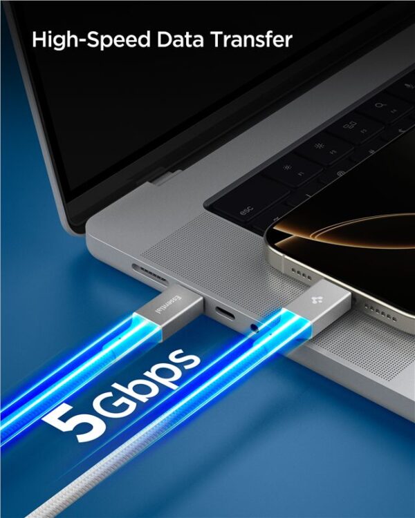 The Spigen Essential EB10015CC is a universal Type-C cable that supports Power Delivery charging up to 100W. This makes it suitable for smartphones and tablets, as well as MacBook and Galaxy Book series laptops. The cable is compatible with a wide range of Type-C devices. Its 150 cm length ensures convenient use in various situations.