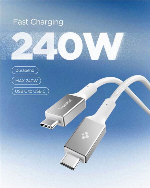 The Spigen Essential EB24015CC is a professional Type-C cable designed for the most demanding devices. It supports Power Delivery charging up to 240W, ensuring lightning-fast and stable charging for laptops, tablets, and smartphones with high power requirements. The cable meets the latest technological standards, offering a comprehensive solution for professional applications.