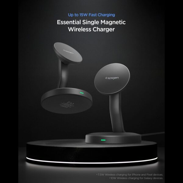 Belaidis įkroviklis Spigen EF151MS Essential yra kompaktiškas įrenginys su MagSafe technologija, užtikrinantis iki 15W įkrovimo galią. Su N52 magnetais jis garantuoja itin tvirtą ir stabilų telefono laikymąsi įkrovimo metu. Dėl galimybės išmanųjį telefoną statyti tiek vertikaliai, tiek horizontaliai, įkroviklis puikiai tinka naršyti turinį, dalyvauti vaizdo skambučiuose ar žiūrėti vaizdo įrašus tuo pat metu kraunant bateriją.