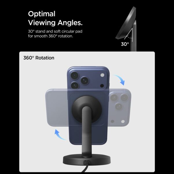 Ergonomiškas stovas su fiksuotu 30° pasvirimo kampu leidžia patogiai naudotis telefonu laisvų rankų režimu įkrovimo metu. Toks žiūrėjimo kampas yra optimalus tiek skaitant žinutes, tiek naršant socialiniuose tinkluose ar žiūrint filmus nelaikant įrenginio rankose. Stovas išlaiko telefoną stabilioje padėtyje, eliminuodamas įrenginio nuslydimo ar pasvirimo riziką.