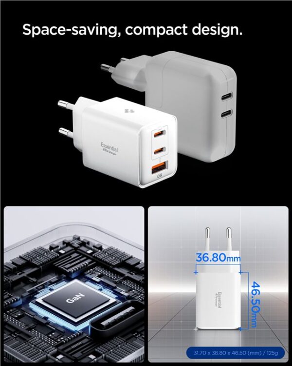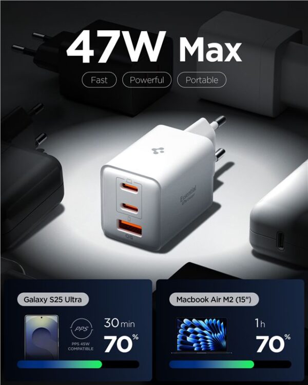 A powerful and compact charger for three devices at once. The Spigen Essential 47W Wall Charger allows for fast and safe charging of up to three devices simultaneously. Thanks to its compact dimensions and intelligent battery protection, it is ideal for both home and travel use.