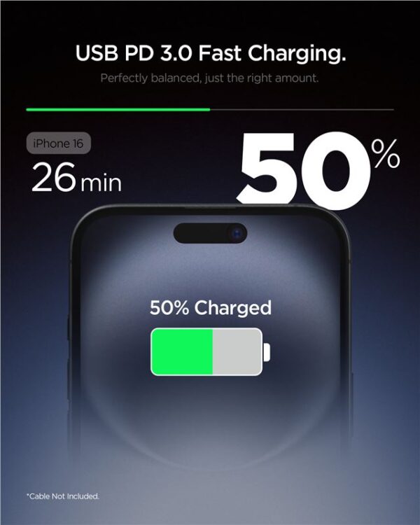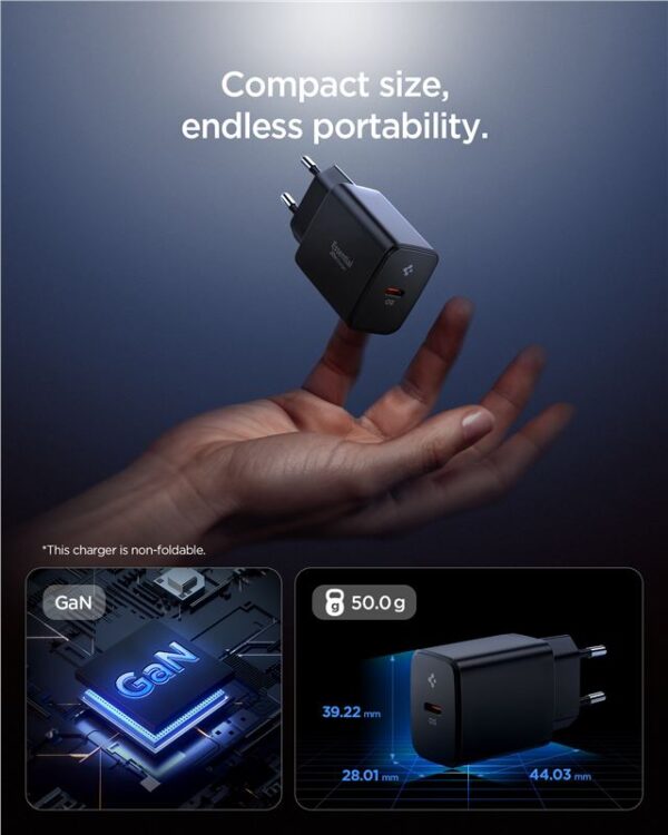 Meet Spigen Essential EE201EU – a compact, extremely efficient wall charger that combines the latest GaN (Gallium Nitride) and Quantum Boost technologies to ensure fast, intelligent and safe charging for any device.