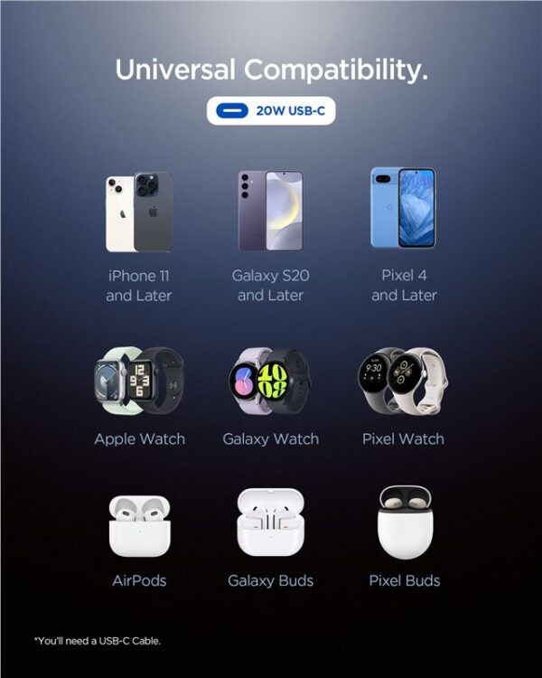 Thanks to the use of Gallium Nitride technology, the charger is smaller, more efficient and produces less heat, which translates into longer life and greater reliability. Quantum Boost: Intelligently adjusting the power to the connected device allows for ultra-fast and safe charging in every situation. 20W power: Perfect for devices that support fast charging.