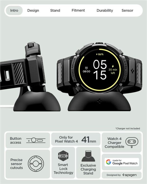 Spigen Rugged Armor Pro + Stand, matinės juodos spalvos – Google Pixel Watch 4 41mm